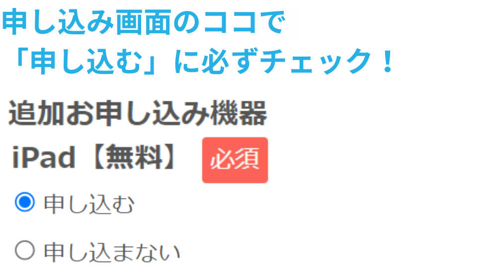 - STEP.3「追加お申し込み機器iPad【無料】」のところで「申し込む」を選択